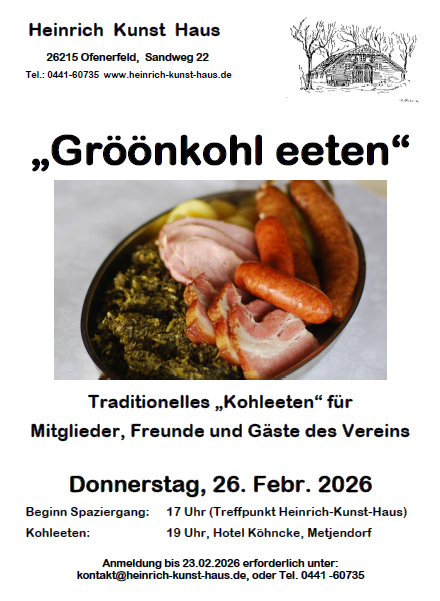 Der Verein „Begegnungsstätte Heinrich Kunst“ veranstaltet am  Donnerstag, 26. Februar für Mitglieder und Freunde des Vereins wieder sein traditionelles „Kohl eeten“. Treffpunkt ist um 17 Uhr beim Heinrich Kunst Haus (Sandweg 22, Ofenerfeld). Nach einem gemütlichen Spaziergang erwartet die Kohlfahrer*innen dann bei Köhncke`s Hotel ab ca. 19 Uhr der herzhafte Grünkohl nebst Beilagen und entsprechenden Getränken. Für die „Verpflegung“ während des Spaziergangs und das Kohlessen (Vorsuppe, Grünkohl, Nachtisch) werden 30 Euro erhoben, die nach der Anmeldung zu entrichten sind. Dazu wird eine Kontoverbindung mitgeteilt. Der Verein bittet um verbindliche Anmeldung bis zum 21. Februar bei Richard Eckhoff unter Telefonnummer 0441-60735 oder 0171-4957241 bzw. per E-Mail unter kontakt@heinrich-kunst-haus.de. Die „Nichtspaziergänger“ können sich ab 18:30 Uhr direkt bei Köhncke`s Hotel einfinden.