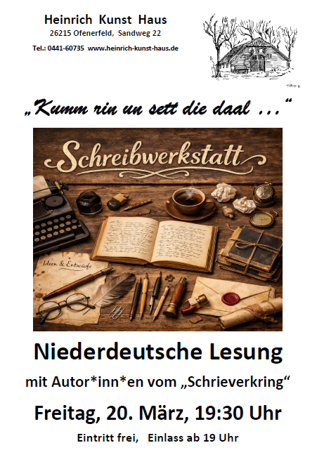 Im Heinrich Kunst Haus wird wieder literarisch „gewarkelt“. Viele niederdeutsche Schriftstellerinnen und Schriftsteller aus dem Weser-Ems-Bereich treffen sich unter Leitung von „Schrieverkring-Baas“ Rita Gnep im gemütlichen Ambiente des Hauses zusammen, um über ihre neuesten Werke zu diskutieren und an ihnen zu arbeiten: das passiert am „Warkel-Dag van`t Schrieverkring“. Am Vorabend, am Freitag, 20. März gibt es aus diesem Anlass eine öffentliche Lesung aus diesen Werken, die die Schriftsteller*innen auch selber vortragen. Die Veranstaltung beginnt um 19:30 Uhr. Der Eintritt ist frei.